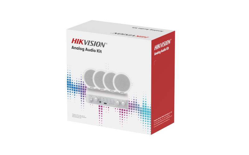 The Hikvision DS-QAE0KA60206-4 is a full analog public address kit featuring a 60W 2-zone amplifier, four 6W ceiling speakers, and multiple audio inputs (mic, RCA, Bluetooth, and USB)—ideal for restaurants, bars, and small-to-medium venues.
