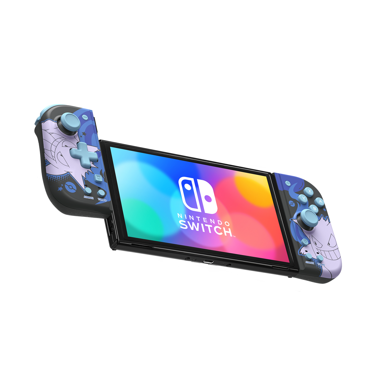 The Split Pad Compact attaches to the Nintendo Switch™ system to provide a full-size controller experience in Handheld Mode. The ergonomic form factor fits your hands perfectly for increased comfort and control. Features include full-size analog sticks and D-pad, turbo functions, and assignable rear buttons. Now available in Pikachu & Mimikyu and Gengar designs. Enjoy a new gaming experience with the Split Pad Compact! (Does not include Motion Controls, HD Rumble, NFC, or IR camera.) Officially Licensed by Nintendo® & The Pokémon Company International.